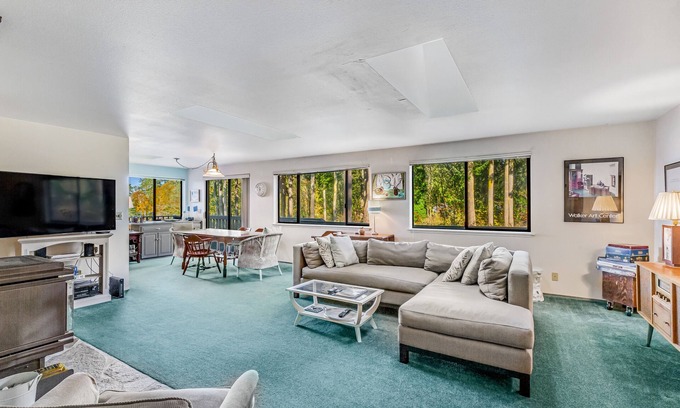 The inviting living space is lined with windows on the upper of the two floors. There's a kitchen with every essential appliance, a dining room table for family meals, and a large sofa where you can lounge about and watch movies by the fireplace each evening. Even more fun awaits in the rec room downstairs, which includes a pool table, another TV, and a stack of board games to enjoy.