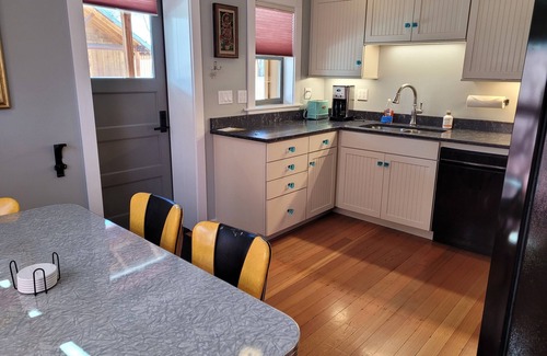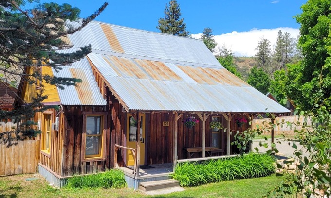 This adorable dog friendly four-bedroom home offers convenient access to restaurants, shopping, and more than 500,000 acres of North Cascades wilderness. Newly remodeled for overnight rental, the home includes a full kitchen, 4 bedrooms and one bathroom with tub/shower, propane fireplace, free internet access, free car charging station, central air conditioning, propane BBQ and off-street parking. There is a king bed, queen bed, double bed, and twin. Step out the door and you are on the ole' western boardwalk!