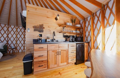 Escape to quaint luxury in our extravagant yurt retreat! A sturdy structured deck surrounds this amazing, round space that houses everything you need for a RELAXING and rejuvenating vacation. A full kitchen, a sleeping area, living room space, and more! Nestled in nature, our cozy yurt offers a unique short-term rental experience complete with a crackling firepit for evening gatherings and a bubbling hot tub for ultimate relaxation under the stars. Brew a hot cup of coffee and settle into one of the decks cozy sitting spots to enjoy your morning as nature slowly wakes up around you, then take a stroll to the firewood shed to collect wood for a crackling fire that evening. Enjoy sunrise colors from your private deck, soak in the hot tub, and more at this amazing retreat space! Immerse yourself in tranquility and enjoy the perfect blend of comfort and adventure.