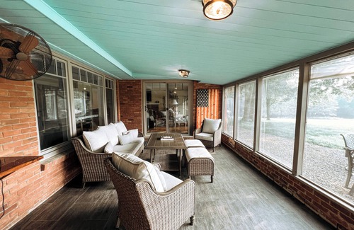 Our ranch house is located in a peaceful and quiet area. There is driveway parking for 4 vehicles and a large yard surrounding the house with plenty of room for games, activities and memory making. The property is 150 acres of land with private trails for hiking and mountain biking. There are outdoor fire pits and a great three season porch to enjoy your morning coffee or local wine in the evening.