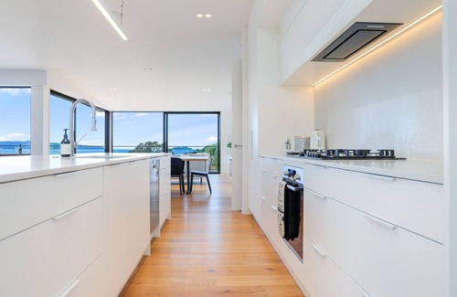The living areas are open plan with fantastic indoor/outdoor flow there are huge ranchsliders across the front of the house that open to the deck. There are two lounges both with flat-screen TVs and comfortable couches and again views of the water. The dining area is off the kitchen and has seating for 6 people.