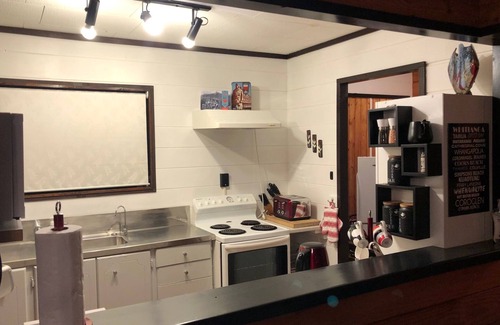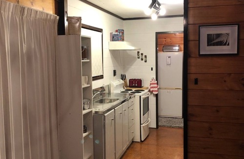 The Lockwood-style wooden walls give off a snugly homely feel, it's a lovely place to stay even in winter. The lounge has comfy seating and a flat-screen smart TV. The kitchen, though small is well equipped with all you need to make your stay stress-free, there's even a coffee machine. The dining area has seating for 6 and access to the back deck with a picnic table.