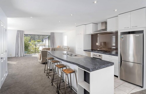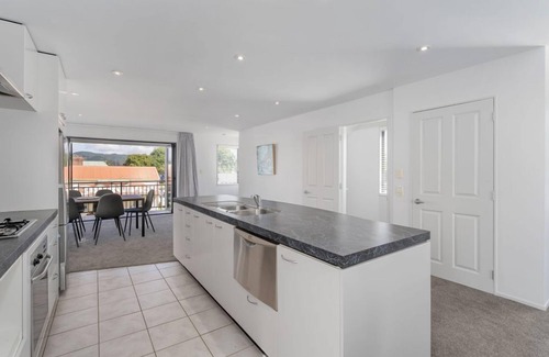 The lounge has comfortable sofas and Flatscreen TV with Chromecast and an HDI plug for a laptop. The doors open onto a deck with outdoor furniture a wee view of the marina and out to the hills. The dining area has a dining table and chairs with seating for 6 people, these doors open onto a balcony and look across to town. The kitchen is well equipped with everything you need for your stay including a dishwasher and full fridge.