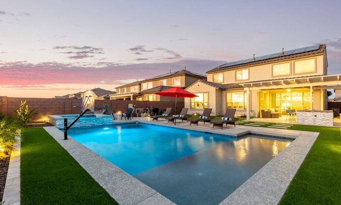 Best-rates for the Surprise house starts from $351 per night with includes Air Conditioner, Internet, Barbecue/Outdoor Cooking, Pool, TV, Accessibility, Bedding/Linens, Wellness Facilities, Child Friendly, Hot Tub, Parking, Security/Safety, Sports/Activities, Kitchen, Laundry, Entertainment, Private Pool, Balcony/Terrace, Fireplace/Heating StayAndPlay offers fully equipped golf villas, golf hotels, golf resorts, luxury golf cabins, and exclusive golf retreats, making it easier than ever to find your perfect golf escape — ideal for families, peaceful getaways, or pet-friendly retreats with the whole crew.