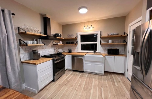 Step into a fully stocked kitchen with a gas stove — perfect for home-cooked meals after a day of hiking or exploring. The open kitchen and dining area flow into a warm and inviting living room ideal for reconnecting with loved ones or streaming your favorite shows.
