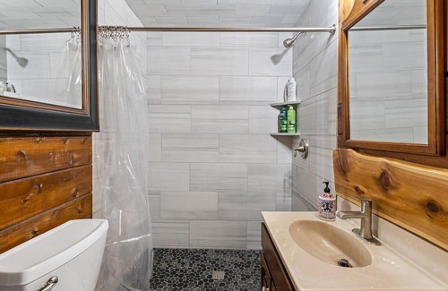 * The Bunkhouse is a separate building a short walk from the main cabin that boasts a second bathroom, a bunk bed, a 50" Smart TV, and an electric fireplace.