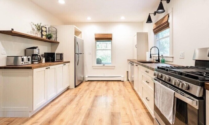 - Fully renovated kitchen with stainless steel Gas Stove, Microwave, Dishwasher, and Refrigerator
