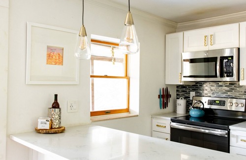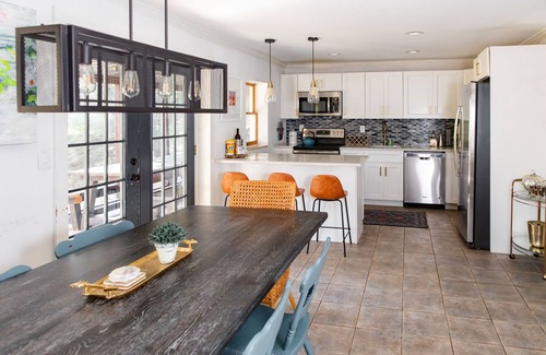 The main living area is located on the main floor of the cabin, with a Crate & Barrel sofa and pair of lounge chairs offering you gloriously comfortable places in which to kick back and forget your worries. Take a read of any of the books in the library, and fire-up the woodburner to stay warm and snug. And, if you get time to watch it, there’s a 50-inch flatscreen TV with Roku to enjoy (and another in the studio above the garage).