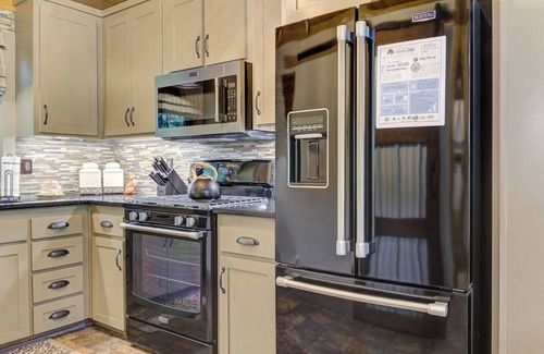 Ideal for couples or a small group, this single-level cabin sleeps up to 4 guests with 2 cozy bedrooms — one with a king bed, the other with a queen — and a shared bathroom. Inside, a warm and inviting living area features plush seating, a gas fireplace, and a big screen TV with a Blu-ray player for movie nights. An electric fireplace adds extra comfort, while board games and TVs in the bedrooms offer more ways to unwind after a day out exploring the Blue Ridge area.