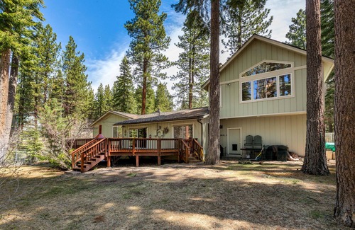 Backing to US Forest Service land, this mountain home has beautiful views of the surrounding woods. You'll also have a fenced-in landscaped yard, large deck , and private hot tub to enjoy the wooded views... and you can hear the babbling brook running by outside! Accommodating up to 10 people, and two large living areas, this remodeled house is filled with log cabin furnishings, offering the perfect setting for a family Tahoe getaway.