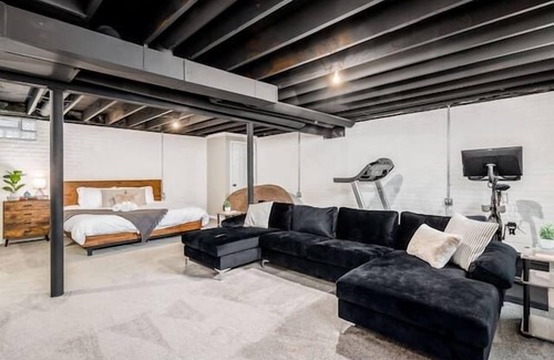 - This is where you will enter the last bedroom (finished side) that offers a king bed. You will also have access to a living room area with a l-shape couch. Right behind the couch is where you will have full access to a lovely Peloton & treadmill to workout at your convenience.