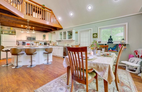 Decorated with unique items and art pieces from antique shops, the chalet exudes a vintage vibe while offering modern comforts like air conditioning and heating via mini splits in every room. Each bathroom is equipped with plenty of towels, a first aid kit, shampoo, conditioner, body wash, a blow dryer, and a fire extinguisher. The main bathroom features a large tub for soaking and recharging.