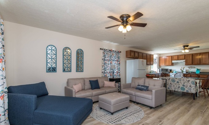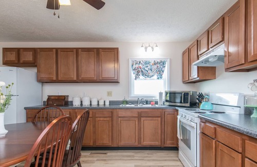 Enjoy the fully equipped kitchen that boasts a beautiful, homey modern vibe. Cook up your favorite meals in the company of your loved ones with all the necessities, including silverware, utensils, pots and pans, coffee pot, microwave, and an electric stove. Take your meals outside to one of the several seating spaces, the private fire pit, or hot tub area.