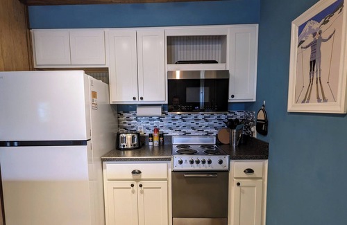 Our 1st floor condo is freshly renovated with a full kitchen, one bedroom and one bathroom. There is a queen bed and NEW 36" twin daybed in the bedroom, a queen sleeper sofa in the family room, and NEW 30" twin daybed in the hallway. Electric fireplace, enclosed 4-season porch with gear storage. Our building also has HOT TUBS, a game room & coin-op laundry facilities.