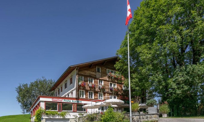 The Hotel Frohe Aussicht hotel enjoys a quiet location in Schwende in the Alpstein Hiking Area. It offers free WiFi, fine regional cuisine, and a sauna. You can enjoy seasonal, fish, games and mushroom dishes and fine wines from the hotel's well-stocked cellar. During summer, you can dine outside on the terrace. It takes you only a 10-minute drive or a 20-minute bike ride to reach Appenzell from Schwende. The station of the Appenzellerbahn is only 656 feet away from the Hotel Hotel Frohe Aussicht.