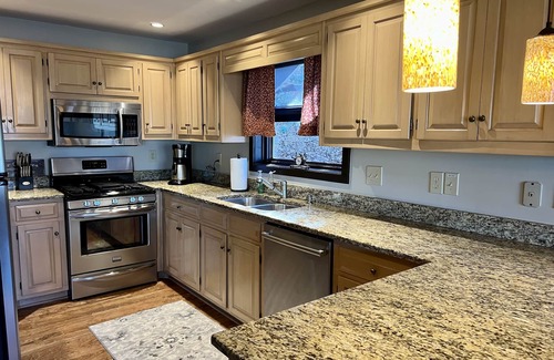 The main floor has large living room with vaulted cedar ceiling, beautiful stone fireplace, large flat screen TV, Wii gaming system and blueray DVD player. The kitchen has granite counters and is fully equipped with gourmet cookware.