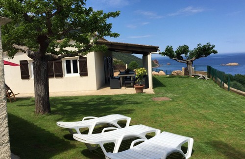 House on the seafront overlooking the Gulf of LAVA .Located 30 km from Ajaccio and 4km from the charming village of Villanova, at the end of a well maintained driveway, our house will welcome you for a quiet and peaceful holiday away from the noise from the city and other inconveniences; peace of mind is the key word for the atmosphere of this beautiful place. The house consists of 2 buildings, the main with dining room, living room, kitchen, 2 bedrooms with double bed, bathroom with toilet and a secondary which is a large room with a bed 2 places and 2 beds 1 place, a bathroom with toilet. A large terrace very well shaded will allow you to take your meals in the fridge and face the sea. If you prefer, you have a dining area where you can grill the fruit of your peach. Children can play quietly because the garden is flat and fenced
