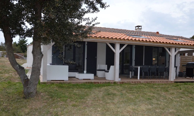 House completely renovated, in a small dead end leading to the beach of Chaucre (Saint Georges d'Oléron), 4 bedrooms (sleeps 9), 1 large bathroom with bath and Italian shower, 1 shower room, a toilet, a fully equipped kitchen, living room, dining room, a large covered terrace facing full on the garden with an outdoor lounge and gas grill, large terrace table and chairs.