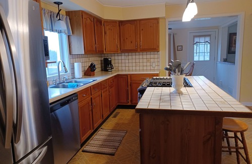 Each bedroom has a queen bed, and we provide all the linens. We also have several additional floor cushions for extra sleeping space, if needed. Our large, fully stocked kitchen has newer appliances and a big island you can gather around to relive your adventures. Or settle into the living room to watch a movie on the large flat-screen TV.
