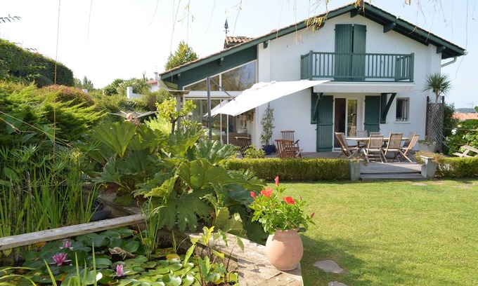 pretty Basque house, bright, 4 bedrooms, large living room + veranda / 2 shower rooms, 2 toilets, neat interior, beautiful garden 15oo m2, large wooden terrace 40 m2 with garden furniture, the village on foot (bakery, grocery store ), quiet, overlooking a meadow, summer kitchen with plancha and barbecue, kitchen