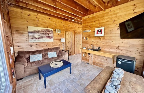 In the attached cottage, which sleeps 6, guests have their own full bathroom and downstairs sitting and bar area with TV. One private bedroom on the first floor sleeps two, while the airy living space upstairs sleeps an additional four people. The second floor space includes a large television and a table with plenty of room for games and puzzles.