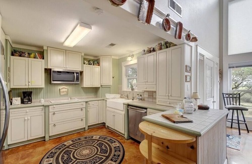 The fully equipped kitchen opens to the grand room and includes a stainless steel refrigerator, glass-top range, and reverse osmosis water dispenser. Relax in the centrally located grand room with a two story vaulted ceiling, floor to ceiling stone fireplace, and fifty five inch flat screen TV. The large wall of window provides great natural sunlight and beautiful hill country views. The master suite offers a king size bed, the second bedroom offers a queen size bed, the third bedroom has two twin size beds, and the fourth bedroom is a bunk room with two twin bunk beds and another twin size bed.