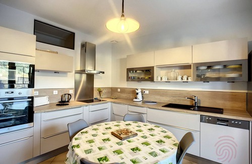 Pretty house of type F4 of 110 m² on one level. A terrace with a table and garden chairs with a beautiful view of Lamalou les Bains. The accommodation is 700 meters from the heart of the city center and 900 meters from the Thermal Baths of Lamalou les Bains, with a SOUTH WEST exposure. A fitted kitchen equipped with a dishwasher, a fridge/freezer, an oven, a microwave, induction hobs, a filter coffee maker, a Senséo coffee maker, a table and four chairs, a television. A living room with a television, a 3-seater non-convertible sofa, 2 armchairs, a table and chairs, a non-functional decorative fireplace. A bedroom with a 160 bed, closet, adjoining bathroom with a shower cabin, sink and toilet. A 2nd bedroom with a 140 bed, wardrobe... giving access to the terrace. A 3rd bedroom with 2 single beds, desk, wardrobe cupboard, WC area, adjoining sink. Separate WC with hand basin. A bathroom with sink and corner bathtub, a hair dryer. A garage for vehicles and bicycles, a dressing area with washing machine and storage cupboard. From the garage to the first level the house is equipped with a Stannah stairlift. Wifi in the house. Rated 4 **** in 2024. PETS ALLOWED. A travel cot for babies can be made available on request within the limit of our stock. Mandatory tax in addition: Tourist tax and Animal tax (2€/day/animal)