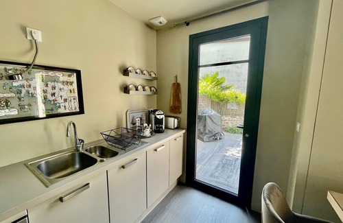 Large 37m2 terrace with garden furniture, 3/4 seater jacuzzi, barbecue, dining area, relaxation area. Access between the gardens of the houses possible on request.