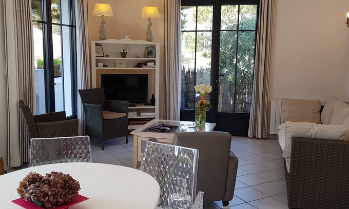 ideally located close to the sea, in the pines, very quiet area. Fully enclosed garden. Terrace of 30m², patio garden.