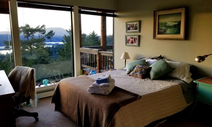 Take it easy at this unique and tranquil getaway that's close to town. Grab your favorite drink and find a comfy resting place on one of the three decks to watch the sunset over Cascade Bay and the Rosario Mansion. You can't get away from the beautiful San Juan views in this midcentury, cozy tri-level home. It comfortably sleeps 6 (with one King, one Queen, and one Queen pullout). Take a stroll right from the front door to Cascade Lake and Moran State Park. Nature and relaxation await you.