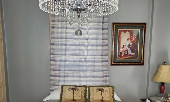 The studio is on the first floor and it has a front porch. Its only a 6-minute drive from downtown Cincinnati. Enjoy proximity, without having to deal with the difficulty of parking or the high traffic of downtown. Bedroom has a queen sized bed with s beautiful chandelier. The living room has a comfortable sofa bed.