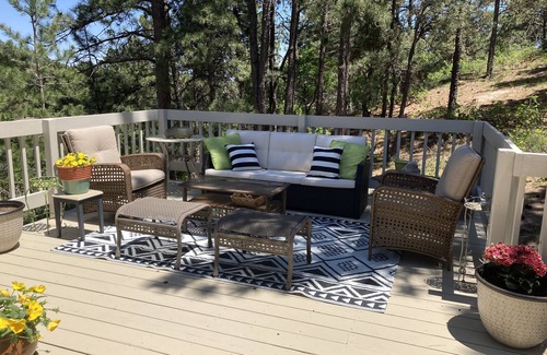 Gorgeous home with 150' long driveway in private cul-de-sac. Guests will rent the entire home. Open floor plan connecting living room and kitchen with island. Quartz countertops, stainless steel appliances, and a large farm sink. The owner is a cook so the kitchen is professionally stocked. One of the most fabulous parts of this house is the oversized deck with seating for at least 20 and dining table with umbrella that looks out onto their private bluff. You can sit and have a drink while watching the wildlife wander by. At night, turn on the bistro lights and star gaze with gorgeous unobstructed views. The homeowner is an artist. Her beautiful art hangs on the walls throughout the house. Located in Northwest Colorado Springs. Close to local restaurants, shopping, the USAFA, and 5 minutes off I-25. Ten minutes from downtown Colorado Springs.
