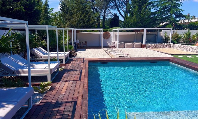 Contemporary villa redone, high -end, air -conditioned 160m² interior on 1000m² of garden with swimming pool, jacuzzi and pétanque field, 3 parking in the interior of the property closed by automatic gate.