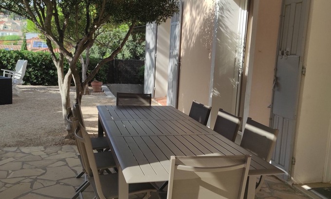 In residential area of Portissol, 100 m from the beach and 10 minutes walk from the port and city center, single storey villa of 90 m2, for 8 people, fully renovated, equipped as a main residence, comprising lounge, dining room, kitchen overlooking garden of 400m2.