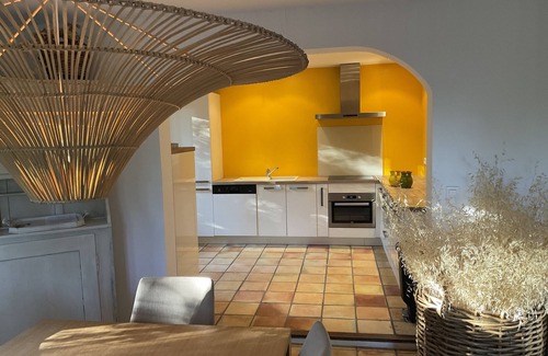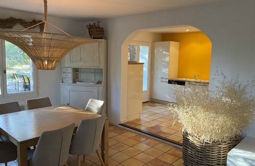 A 90-sq.m, newly renovated, single storey house presents a main living area with a lounge area with a TV and a dining room opening on the kitchen. The kitchen offers an induction hob, an oven, a microwave, and a fridge freezer. The master bedroom has a 140-cm double bed and an en suite bathroom with WC. Two other rooms — one with two twin beds and one with a 140-cm double bed — share a bathroom. There is a separate toilet. The laundry room features a washing machine, a tumble dryer, and a freezer. The barbecue area boasts a stone table. There is a shaded terrace by the swimming pool.