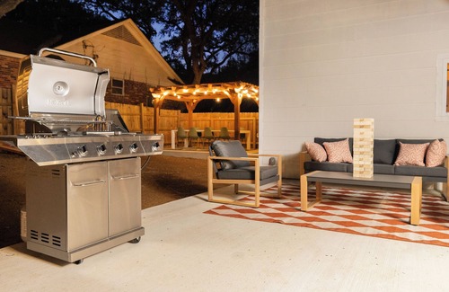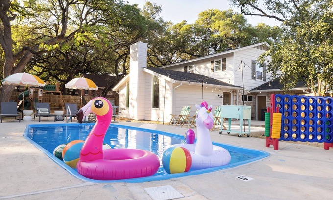 5 minutes from SAT & close to all major attractions in San Antonio! Your extended family and friends will enjoy this massive house w/a gorgeous pool, beach chairs, & umbrellas, a cozy fire pit, a massive pergola, a playground, outdoor games, and an IG-worthy mural. Relax in the vibe-y game room w/pool table, shuffle board, arcade games, and a photo-op backdrop. Have coffee at the generously stocked coffee bar with a Keurig. WFH guests will love high speed internet & a quiet work space.