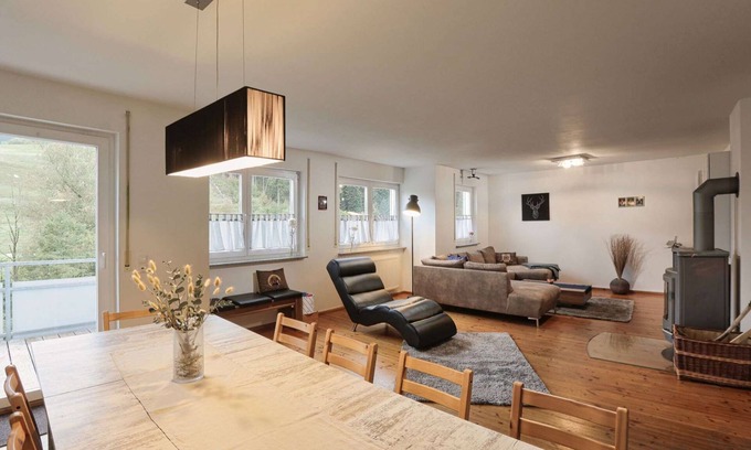 The open plan living / dining area adjoins the kitchen. This invites you to linger together with a cozy sofa and a large dining table. A pleasant feel-good atmosphere is additionally created by the existing stove. Here you can put your legs up in the evening and toast to the beautiful day with a glass of wine or a cool beer from the Alpirsbacher brewery.