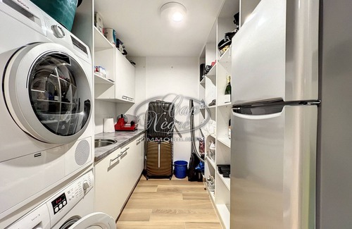 - Level 1: Landing with separate toilet and cupboards, then arrival in a corridor leading to a modern shower room with high quality materials with washbasin and WC, on the same level on the left, a laundry room (with fridge/freezer, washing machine, dryer, washbasin, storage...) and a double bedroom (air-conditioned) with television and storage, accompanied by a garden view from the window.