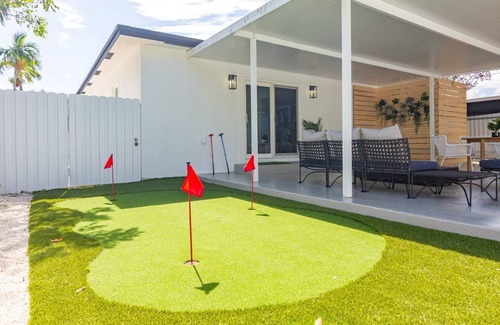 The garden features, outdoor seating, a grill, and a mini golf area.
