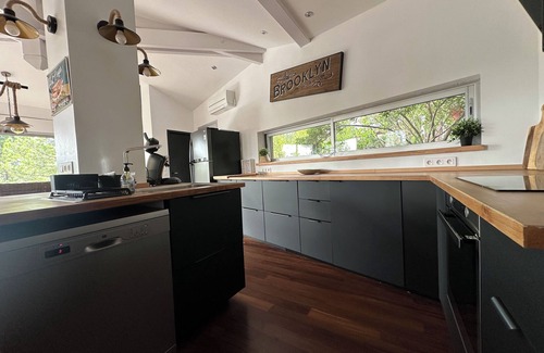 It consists of a large living room with fully equipped kitchen (induction hob, dishwasher, freezer, fridge, microwave, toaster, Senseo coffee ..) a TV corner with sofa