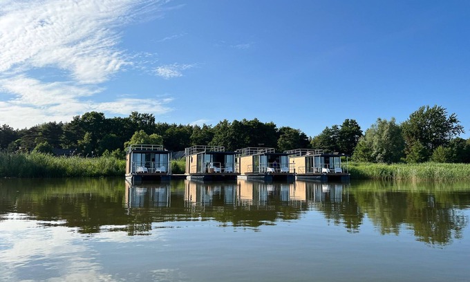 Houseboat is a charming, spacious cottage designed with comfort and relaxation in mind. Its unique location on the water creates an unforgettable atmosphere and allows you to enjoy the peace of nature. The large terrace on the roof of the house is an ideal place to relax outdoors. There is comfortable furniture where you can sit, relax and enjoy the beautiful views. On the ground floor of the house there is a covered terrace with garden furniture, which offers additional space for relaxation and outdoor meetings. It's the perfect place for a morning coffee or an evening drink overlooking the water. The house on the water is equipped with air conditioning and heating, which makes it comfortable and friendly for every season. Regardless of the weather, you can enjoy a pleasant temperature inside the cottage. The recreation center is beautifully located directly on Lake Jamno, about 200 meters from the sea, right next to the forest. The plot is covered with old trees, Guests have at their disposal a free parking lot, a playground for children, a place to light a bonfire, a grocery store, a motorboat cruise and a rental of: bicycles, water bikes, electric scooters, water bikes and a barbecue. There are shops, restaurants and bars nearby. Łazy is a small and quiet seaside town, surrounded by lakes and forests, a perfect place for people looking for relaxation surrounded by nature and away from the crowds. Surrounded by the calm sea, fresh air and breathtaking landscapes, guests can fully relax and break away from everyday worries. Numerous bicycle paths allow guests to explore the area on two wheels, enjoying the beauty of nature.