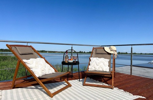 Houseboat is a charming, spacious cottage designed with comfort and relaxation in mind. Its unique location on the water creates an unforgettable atmosphere and allows you to enjoy the peace of nature. The large terrace on the roof of the house is an ideal place to relax outdoors. There is comfortable furniture where you can sit, relax and enjoy the beautiful views. On the ground floor of the house there is a covered terrace with garden furniture, which offers additional space for relaxation and outdoor meetings. It's the perfect place for a morning coffee or an evening drink overlooking the water. The house on the water is equipped with air conditioning and heating, which makes it comfortable and friendly for any season. Regardless of the weather, you can enjoy a pleasant temperature inside the cottage. The recreation center is beautifully located directly on Lake Jamno, about 200 meters from the sea, right next to the forest. The plot is covered with old trees, Guests have at their disposal a free parking lot, a playground for children, a place to light a bonfire, a grocery store, a motorboat cruise and a rental of: bicycles, water bikes, electric scooters, water bikes and a barbecue. There are shops, restaurants and bars nearby. Łazy is a small and quiet seaside town, surrounded by lakes and forests, a perfect place for people looking for relaxation surrounded by nature and away from the crowds. Surrounded by the calm sea, fresh air and breathtaking landscapes, guests can fully relax and break away from everyday worries. Numerous bicycle paths allow guests to explore the area on two wheels, enjoying the beauty of nature.