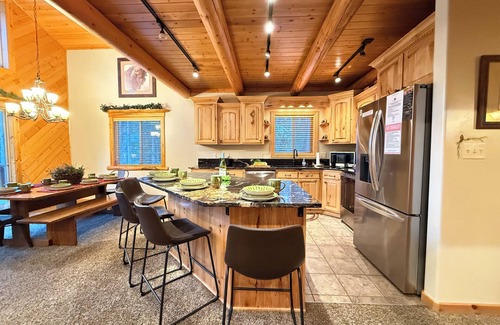 Welcome to your rustic Huckleberry Lodge, nestled on a quiet wooded lot near Sawtelle Mountain. Huckleberry Lodge consists of six private bedrooms, three full bathrooms, a spacious living room with a gas fireplace, dining room and kitchen. The kitchen is fully furnished and equipped for bigger groups including a large dining table. Don't forget your favorite grilling foods; a BBQ grill is available for outdoor cooking! This home is perfect for larger groups or families who are looking to explore Yellowstone or enjoy the trails throughout Island Park. This private lodge is a great place to get away from the stress of everyday life with all the modern amenities. Located just a short distance from Highway 20 for easy access to Yellowstone and everything Island Park has to offer. The Lodge may be rented with the neighboring property (Huckleberry Inn) for additional living space if you have a larger group. There is separate pricing for the additional cabin.