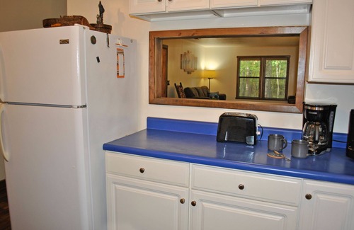 This cabin is perfect to kickback, relax, and enjoy the outdoors. It can sleep six with 2 bedrooms having queen beds in each, and then a queen sofa bed in the living room. The living space is 1,064 square feet. Works great for a small group or makes a nice getaway for a couple. Full sized appliances, microwave, and complete sets of cook ware and dishes make meal planning and preparation easy.