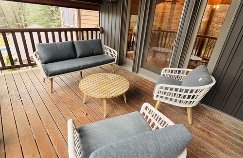 This home features 3 bedrooms, as follows: 1st floor-King Bed with private bath. Upstairs: Bedroom 1: 1 Twin/Full Bunk Bed and Queen over Queen Bunk. Upstairs Bedroom 2: Queen Bed. Upstairs, we have a beautiful vaulted deck for guests to enjoy. We also have a futon and additional spaces for guests to sleep.