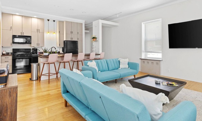 Once inside, you will first see 2 bedrooms with a King bed in each. 1 bedroom has a twin pullout chair, for the additional 5th guest if needed. Further down the hall, you'll see the large, updated bathroom with in-unit laundry, then you'll make your way the open concept kitchen and living room. The kitchen & living room are great size and have plenty of seating. Enjoy the front views overlooking Main St!