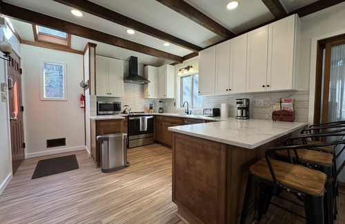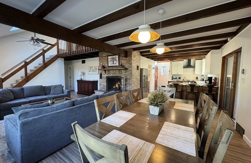 The house is perfectly sized for any group large or small. Enough space to spread out and separate groups, or join in the fun together. The large fully equipped kitchen holds a breakfast bar, microwave, coffee maker and stainless steel appliances and wraps around to join both the dining and living room areas with a wood burning fireplace. You'll be able to enjoy the fire while you dine.