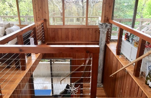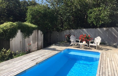 Nestled in nature, surrounded by trees this is a huge 4 bd/2.5 ba house with The Best Views in the Pines. The heated saltwater pool has both sun and covered lounge areas and a lush garden. There is an outdoor shower, a pool deck fridge and a bluetooth equpped stereo. It is 2 minutes to the beach. Kayaks and paddle boards are available for use on the bay, also 2 minutes away. There are four large bedrooms each with king beds and a/c, and two newly renovated full bathrooms. The living space is an open floor plan. On the right is with a huge great room, piano, TV, and fireplace with windows overlooking the pool, and a powder room. To your left is the kitchen and dining room. The dining table seats eight and The kitchen area has stainless steel appliances and an eat-in countertop. There is a wrap around side deck and a huge back deck next to the kitchen with a gas grill, lounge area and outdoor dining for eight. The large roof deck offers 360 views, covering the bay, ocean, the Pines and the far east of Fire Island. Sunsets are spectacular! All decks have teak furniture and planted flower boxes. WiFi is available throughout. The experience is like being in a large luxurious, well-equipped treehouse.