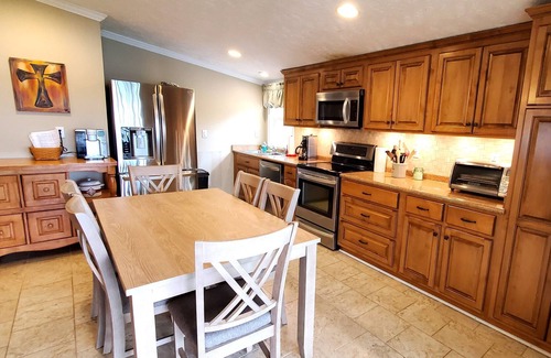 Fun, fun, fun on the lake. Large boat house with room for boats and jet ski. Boat House has a Charcoal Grill, dining seating for 6, and fishing rod holders for you to catch your dinner. Large screened porch with spectacular views of the Lake and room for dining or relaxing. Eat-in Kitchen with Stainless Steel appliances and a table for 6. King sized beds in all 3 bedroom each with their own TV with cable access.