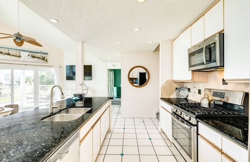 One of the highlights of Rum Cove is its large, fully equipped kitchen, perfect for preparing delicious family meals and creating lasting memories. The kitchen features modern appliances, ample counter space, and all the essentials you need to prepare & serve up your family’s favorite beach eats. Gather around the dining table or enjoy casual meals at the breakfast bar – there's room for everyone to dine together and savor the vacation experience.